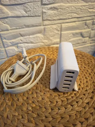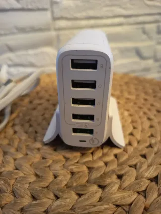 Cargador USB con cinco puertos para tus dispositivos. Uno de los puertos ofrece carga rápida. - Cinco puertos USB disponibles. - Diseño compacto y moderno. - Incluye base de soporte.