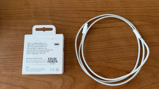 Cable original de Apple para conectar dispositivos con puerto USB-C a dispositivos con puerto Lightning. Tiene una longitud de 1 metro. - Comprado el 05/05/25 - Conector USB-C en un extremo. - Conector Lightning en el otro extremo.