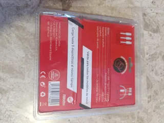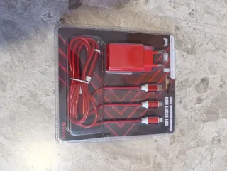Cargador de pared Iwotto en color rojo, ideal para cargar múltiples dispositivos. - Incluye un cargador de pared. - Tres cables de carga con luces LED. - Diseño compacto y moderno.