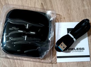 Base de carga rápida inalámbrica, nueva a estrenar. Es negra y tiene un diseño compacto y elegante. - Carga rápida inalámbrica. - Incluye cable USB. - Diseño elegante y compacto.