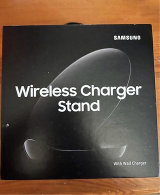 Cargador inalámbrico tipo stand de Samsung. Incluye cargador de pared. - Diseño elegante y moderno. - Compatible con carga inalámbrica.