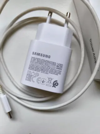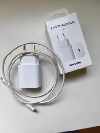 Cargador rápido Samsung de 25W con puerto USB-C y cable a juego. - Adaptador de corriente PD. - Incluye cable USB-C a USB-C de 1 m., Samsung original también. Usado muy poco, en perfectas condiciones. Sólo envío.