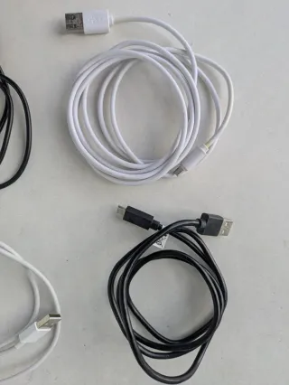 Lote de cargadores y cables para tus dispositivos electrónicos. Incluye varios tipos de conectores. - Cargadores de pared tipo enchufe europeo. - Cables USB a Micro USB. - Cables USB a USB-C. - Cables USB a Lightning.
