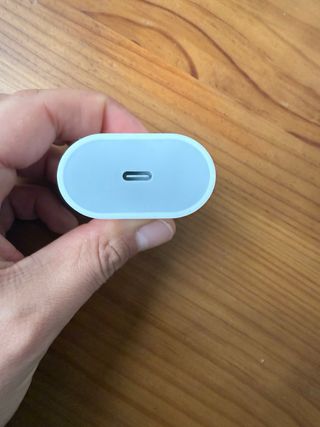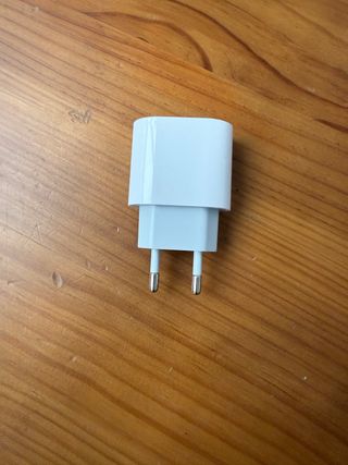 Adaptador de corriente blanco con conexión Tipo C. Pines europeos para enchufar.