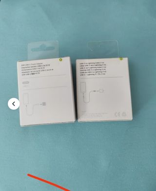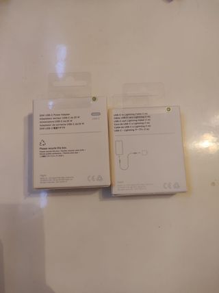 Lote de accesorios de carga de Apple. - Cable USB-C a Lightning (1 metro). - Cable USB-C a Lightning (2 metros).