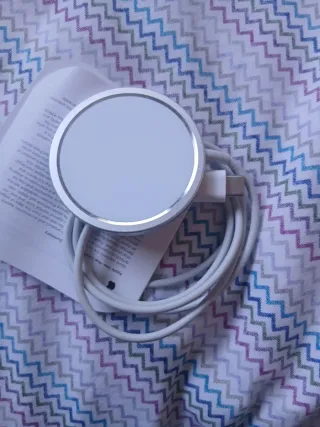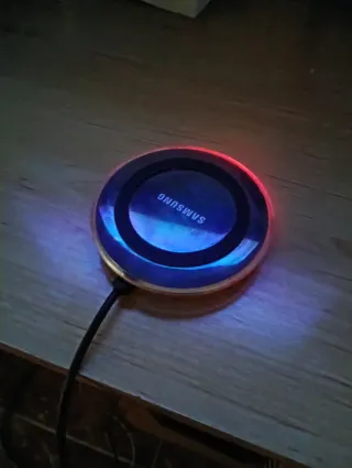 Cargador inalámbrico con un diseño circular y moderno. Cuenta con luces LED que indican su estado. - Base de carga redonda. - Indicadores LED. - Cable de conexión incluido.como nuevo recojida en córdoba capital.