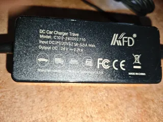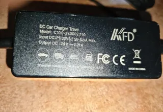 Cargador de coche KF D para viajes. - Modelo: C100-240002710. - Entrada: PD 20V 3.25A - 5.0A Max. - Salida: DC 24V - 2.71A. - Fabricado por Shenzhen Huikayuan Electronic Technology Co.,Ltd. - Incluye cable USB-C.
