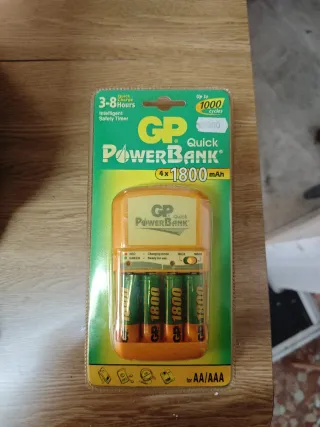 Cargador rápido GP Powerbank para 4 pilas AA de 1800mAh. - Carga rápida de 3 a 8 horas. - Temporizador de seguridad inteligente. - Hasta 1000 ciclos de carga. - Indicadores LED para modo de carga y listo para usar. - Compatible con pilas NiCd y NiMH.