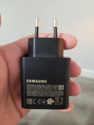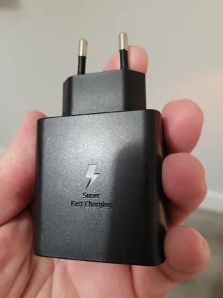 Adaptador de corriente Samsung con tecnología Super Fast Charging. - Diseño compacto y portátil. - Dos clavijas para enchufe europeo.