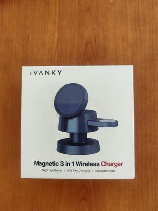 Vendo cargador inalámbrico 3 en 1 de la marca iVANKY. Es un dispositivo elegante y práctico. - Carga inalámbrica para tres dispositivos simultáneamente. - Incluye modo luz nocturna. - Ofrece carga rápida de 15W. - Permite ajustar el ángulo.