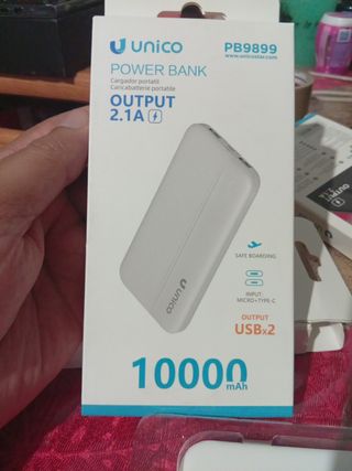 Cargador portátil Unico de 10000 mAh. - Salida de 2.1A. - Puertos de entrada: Micro USB y Type-C. - Doble salida USB. - Diseño compacto y ligero.