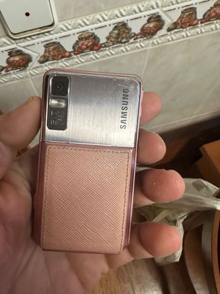 Teléfono móvil Samsung F480 en color marrón y plateado. Diseño clamshell. -le falta el cargador - Pantalla principal. - Cámara. - Botones de navegación.