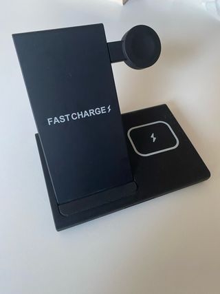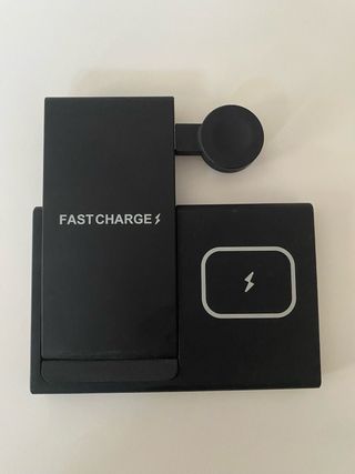 Base de carga inalámbrica en color negro. Diseñada para cargar varios dispositivos a la vez. - Soporte para carga vertical. - Base de carga plana. - Indicador de carga. - Incluye cable USB tipo C