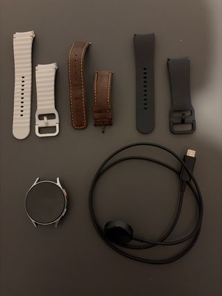 Samsung Galaxy Watch 7 de 44mm, incluyendo correas de diferentes estilos y un cargador. - Dos correas de silicona, una color gris claro y la otra color azul - Correa de cuero color marron - Cargador inalámbrico original
