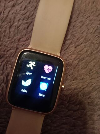 Reloj inteligente marca Blackview ,rosa palo,con diferentes funciones como,alarma,registros deportivos,cronómetro,ritmo cardíaco, relájate(ayuda a ajustar la respiración y se relaje),música remota etc... La correa está un poco desgastado el color,lo demás está como nuevo viene en su caja con el libro de instrucciones y cargador. Precio mercado 29.90e ,lo de a9