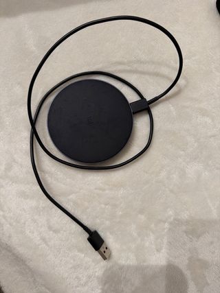 Cargador inalámbrico de color negro. - Diseño circular. - Logo de la marca en el centro. - Cable USB incluído