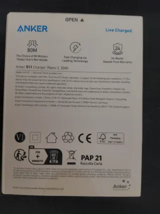 Cargador usb c. Anker Tecnología gan, más pequeño y liviano. Potencia 30w. Precintado.