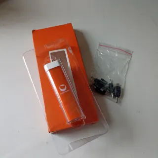 Cargador portátil de color naranja con logo de Daikin, presentado en su embalaje original. - Incluye varios adaptadores de conexión.