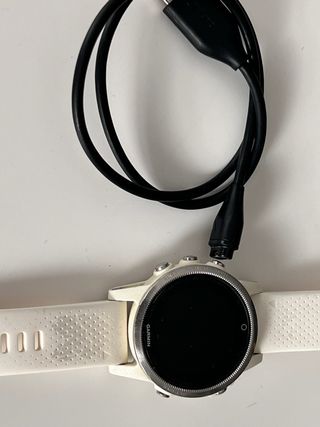 Reloj inteligente Garmin 5S en color blanco. Incluye su cable de carga. - Diseño deportivo y elegante. - Correa de silicona perforada. - Bisel metálico. - correas de recambio de regalo