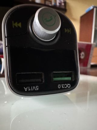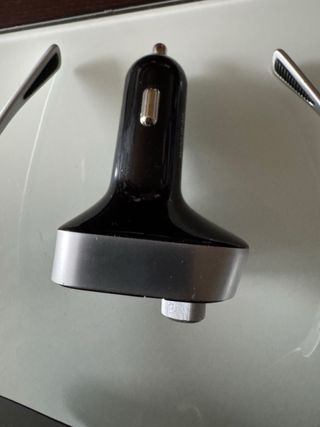 Dispositivo manos libres para coche que también funciona como cargador. - Diseño elegante en color negro y plateado. - Puerto USB para carga de dispositivos.