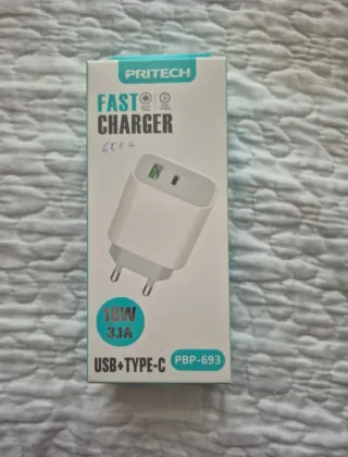 Cargador rápido PRITECH para dispositivos móviles. - Potencia de 18W. - Puertos USB y Type-C. - Modelo PBP-693.
