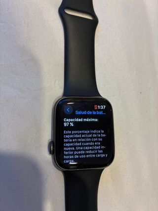 Vendo Apple Watch Series 5 de 40 mm en muy buen estado de uso. Funciona perfectamente y en las fotos se puede ver su estado real. Tiene algún pequeño roce superficial propio del uso, que no se ve en la pantalla cuando esta encendida y que no afecta en nada al funcionamiento. Lo vendo porque me han regalado otro. Incluye: Correa original rosa, Pieza extra de correa para distintas tallas, Cargador original en perfecto estado. El porcentaje de salud de batería es del 70% pero aguanta un día completo con uso normal, incluyendo entrenos, sin necesidad de cargarlo a mitad del día. Escribeme si tienes alguna duda!