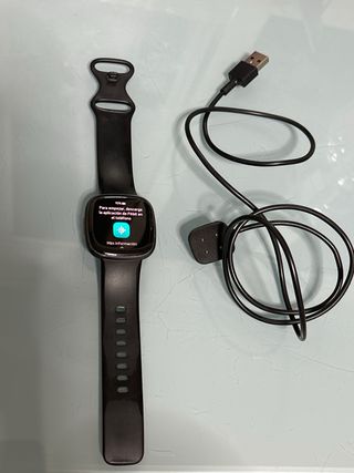 Reloj inteligente Fitbit Versa 4 en color negro, con su cargador. - Diseño elegante y moderno. - Correa ajustable. - Incluye cable de carga USB.