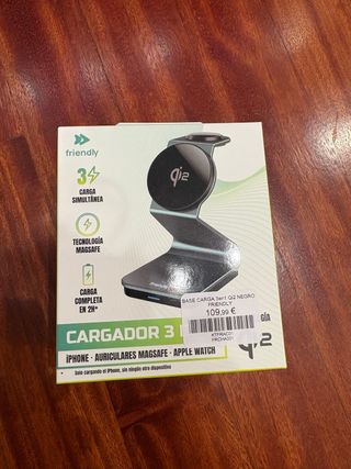 Base de carga inalámbrica INI en perfecto estado. Incluye cargador para teléfono, reloj y auriculares. - Carga inalámbrica para tres dispositivos simultáneamente. - Diseño elegante y compacto. - Material: PC+ABS. - Entrada: 5V/3A, 9V/2A. - Salida: 5W/7.5W/10W/15W