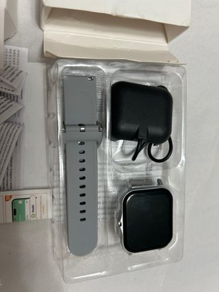 Reloj inteligente con un diseño moderno y elegante. - Pantalla cuadrada. - Correa intercambiable. - Incluye cargador.