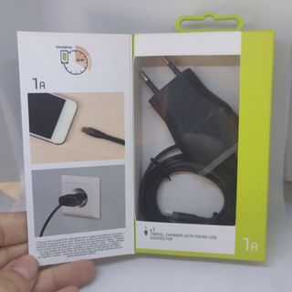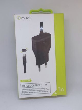 Cargador con MicroUSB marca Muvit, el cargador se ha sacado de su caja pero tiene muy poco uso (prácticamente ninguno). Tiene un diseño especial el conector MicroUSB que acepta ser conectado en las dos posiciones. No se separa el cable del adaptador, todo es una pieza. Para usar de cargador de viaje.