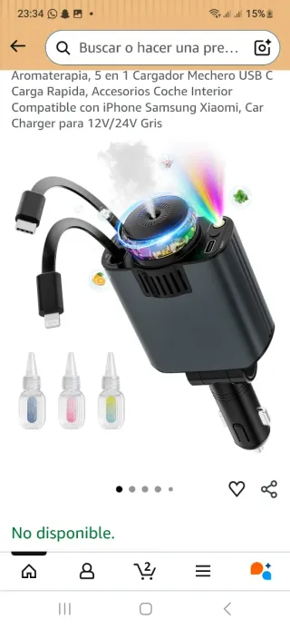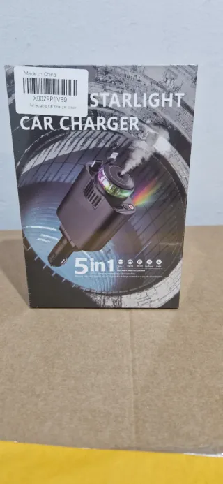 Cargador de coche multifuncional con función de aromaterapia y humidificador. Ideal para mantener el ambiente de tu vehículo agradable. - Diseño compacto y moderno. - Incluye cables USB C y Lightning. - Compatible con tomas de 12V/24V. - Luces LED de ambiente.