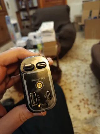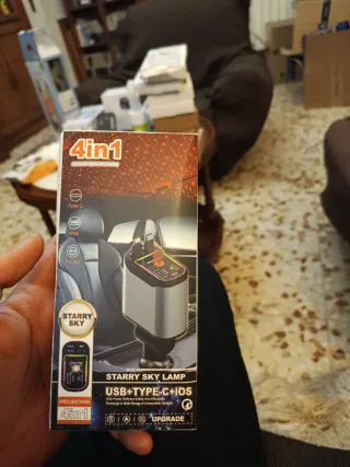 Este cargador para coche tiene un diseño de cielo estrellado y múltiples funciones. - Carga rápida USB y Tipo-C. - Incluye puerto para iOS. - Función de proyección. - Diseño 4 en 1.