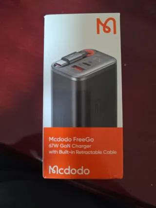 cargador de pared GaN Mcdodo FreeGo de 67W con cable retráctil incorporado. Utiliza tecnología GaN avanzada para una carga eficiente y potente. Cuenta con puertos USB-C y USB-A para cargar varios dispositivos simultáneamente. El cable USB-C retráctil incorporado mide 65 cm (aproximadamente 25 pulgadas) de largo y soporta hasta 60W. La potencia de salida máxima es de 67W a través del puerto USB-C. Tiene un diseño compacto y portátil, ideal para viajes u oficina.
