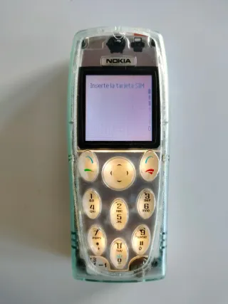 Teléfono móvil clásico de la marca Nokia en color plata. Un diseño icónico y fácil de usar.CON CARGADOR - Pantalla con mensaje Inserte la tarjeta SIM. - Teclado numérico completo. - Botones de navegación y llamada.