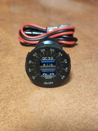 Cargador doble USB para coche con tecnología Quick Charge 3.0 y voltímetro integrado. - Dos puertos USB para carga rápida. - Pantalla LED que muestra el voltaje. - Diseño circular para montaje en panel. - Interruptor ON-OFF.