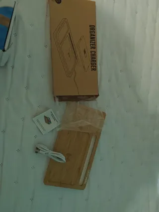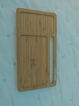 Organizador de bambú con cargador inalámbrico integrado. - Fabricado en bambú natural. - Diseño moderno y funcional. - Incluye símbolo de carga inalámbrica.