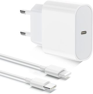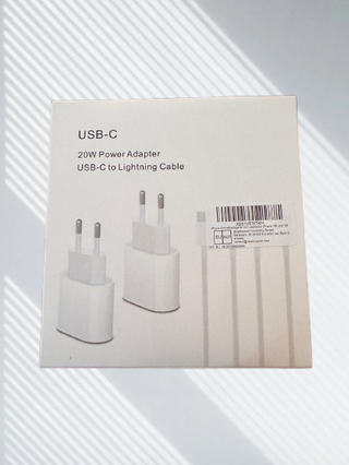 Se vende cargador de pared USB-C de 20W y cable USB-C a Lightning de 1 metro. - Cargador de 20W. - Cable de 1 metro de longitud USB-C a Lightning