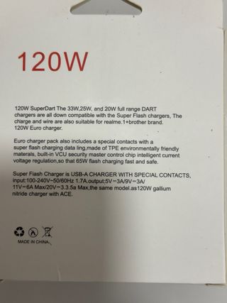 Adaptador de corriente de carga rápida de 120W con cable tipo C. - Potencia de 120W. - Incluye cable de datos tipo C.