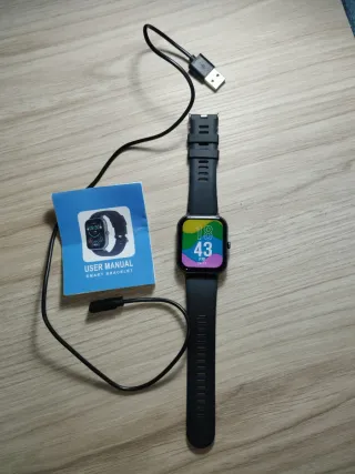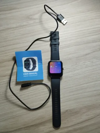 Reloj inteligente con correa negra. - Pantalla cuadrada. - Correa con múltiples orificios para ajustar - Viene Cargador Original - Viene Caja Original - Viene Con Las Instrucciones EN PERFECTO ESTADO