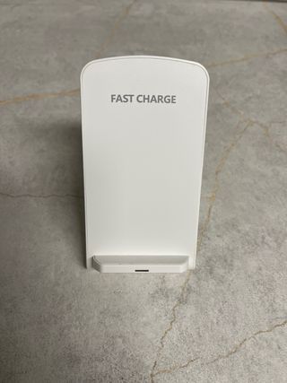 Cargador inalámbrico para móviles con carga inalámbrica. Marca Samsung de color blanco. Base de goma antideslizante. Compatibles con móviles Android e iPhone. - Diseño circular. - Incluye cable USB.