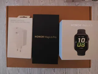 Teléfono Honor Magic 6 Pro en color negro, junto con un cargador Honor SuperCharge de 100W y un reloj Honor Watch 5. - Cargador Honor SuperCharge GaN (Max 100W). - Honor Watch 5. Regalo fundas y protectores dé pantalla para ambos dispositivos.