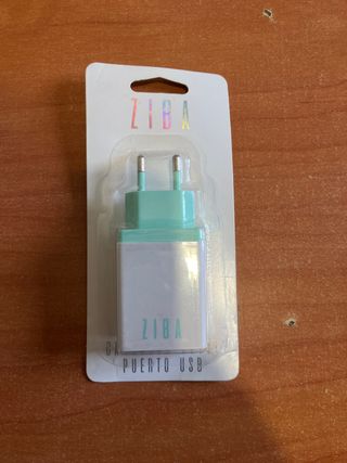 Cargador de pared ZIBA con 2 puertos USB, sin cable. - Diseño compacto y moderno. - Color blanco y verde menta. - Ideal para cargar dispositivos móviles.