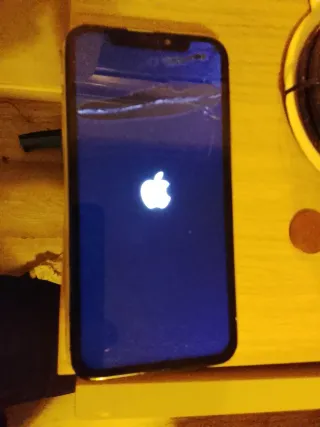 iPhone XR de Apple, color negro y azul. Ideal para piezas o reparaciones. - Pantalla con el logo de Apple. - Parte trasera del teléfono.