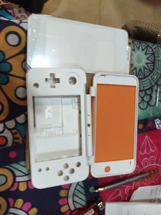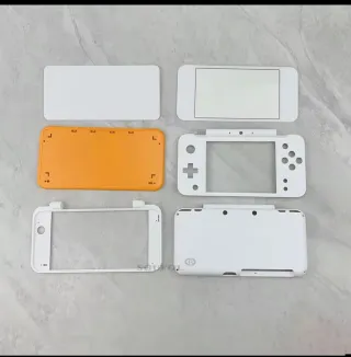 Conjunto de carcasas de repuesto para la consola Nintendo NEW 2DS XL. - Carcasa inferior de color naranja. - Carcasas superiores y frontales de color blanco. - Incluye piezas para la pantalla superior e inferior.