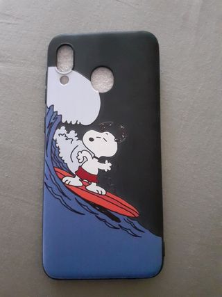 Funda de silicona para Samsung Galaxy A20e con un divertido diseño de Snoopy surfeando una ola. - Material: Silicona. - Diseño: Snoopy en tabla de surf. - Color: Negro con detalles de olas y personaje.