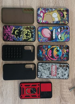 Lote de fundas para Samsung Galaxy S22 con diversos diseños. - Funda transparente con borde verde. - Funda con diseño de Los Simpson. - Funda con diseño abstracto colorido. - Funda con diseño de personaje de cómic. - Funda negra con relieve. - Funda negra lisa. - Funda con diseño de cómic Marvel. - Funda roja y negra con soporte. Si se compran en lote todas por 25€ Si es individual a 2,5€ unidad