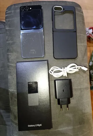 Teléfono móvil Samsung Galaxy Z Flip 5 en color grafito y con 512GB de almacenamiento. (Lo que se ve en la pantalla pequeña es un protector de pantalla, no es la pantalla la q esta rota, solo es el protector, el movil esta en perfecto estado y funciona muy bien) (Tiene una pequeña marca en la segunda foto, llevo con esa marca 7 meses y no ha pasado nada, de ahí su precio) - Diseño plegable. - Pantalla exterior. - Cámara dual trasera. (Viene con cargador, funda y caja original)