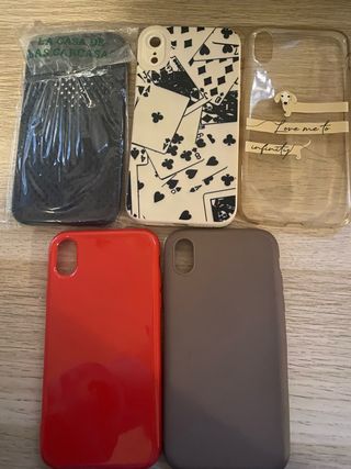 Lote de cinco fundas para iPhone XR. Incluye fundas de diferentes estilos y colores para proteger tu móvil. - Funda negra con embalaje original. - Funda transparente con diseño de perro salchicha y texto. - Funda con estampado de cartas de póker. - Funda roja lisa. - Funda gris lisa.