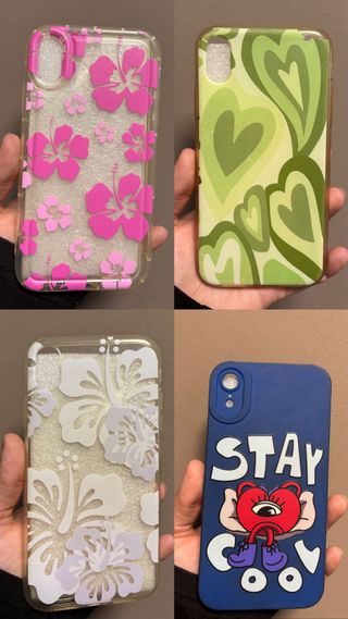 Lote de fundas para iPhone XR con diferentes diseños. - Funda transparente con flores rosas. - Funda con diseño de corazones verdes. - Funda transparente con flores blancas y lilas. - Funda azul con diseño 'Stay Cool'.