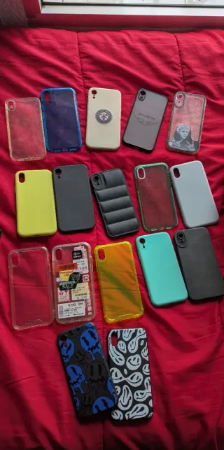 Lote de fundas para iPhone XR con diversos diseños. - Funda color crema con círculos. - Funda transparente roja. - Funda roja lisa. - Funda gris con nubes. - Funda morada con caras sonrientes. - Funda rosa con rayos. - Funda con estampado de cebra. - Funda color menta lisa.